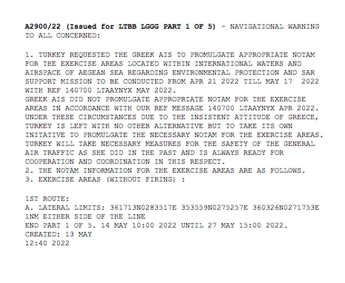 Η Αγκυρα με τη διεθνή αγγελία Α 2900/2022, την οποία εξέδωσε στις 13 Μαΐου 2022, ημέρα Παρασκευή και ώρα 12.40, ενημέρωσε τη διεθνή κοινότητα (ΙCΑΟ, ΟΗΕ, ΙΜΟ, Ε.Ε., ΝΑΤΟ, υπουργείο Αμυνας των ΗΠΑ, Στέιτ Ντιπάρτμεντ, FAA, ΥΠΕΞ, ΥΕΘΑ,ΥΕΝ, ΥΠΑ κ.λπ.) ότι, επειδή η Ελλάδα προσπαθεί παράνομα να χτίσει κυριαρχία στο Αιγαίο που δεν της ανήκει και επειδή εμμένει στην παρανομία αυτή, η Τουρκία αναγκάστηκε να εκδώσει την αγγελία Α 2900/22 για εκτέλεση τουρκικής άσκησης στο Αιγαίο (εντός FIR Αθηνών) για την προστασία του περιβάλλοντος και την υποστήριξη αποστολών έρευνας – διάσωσης (SAR).