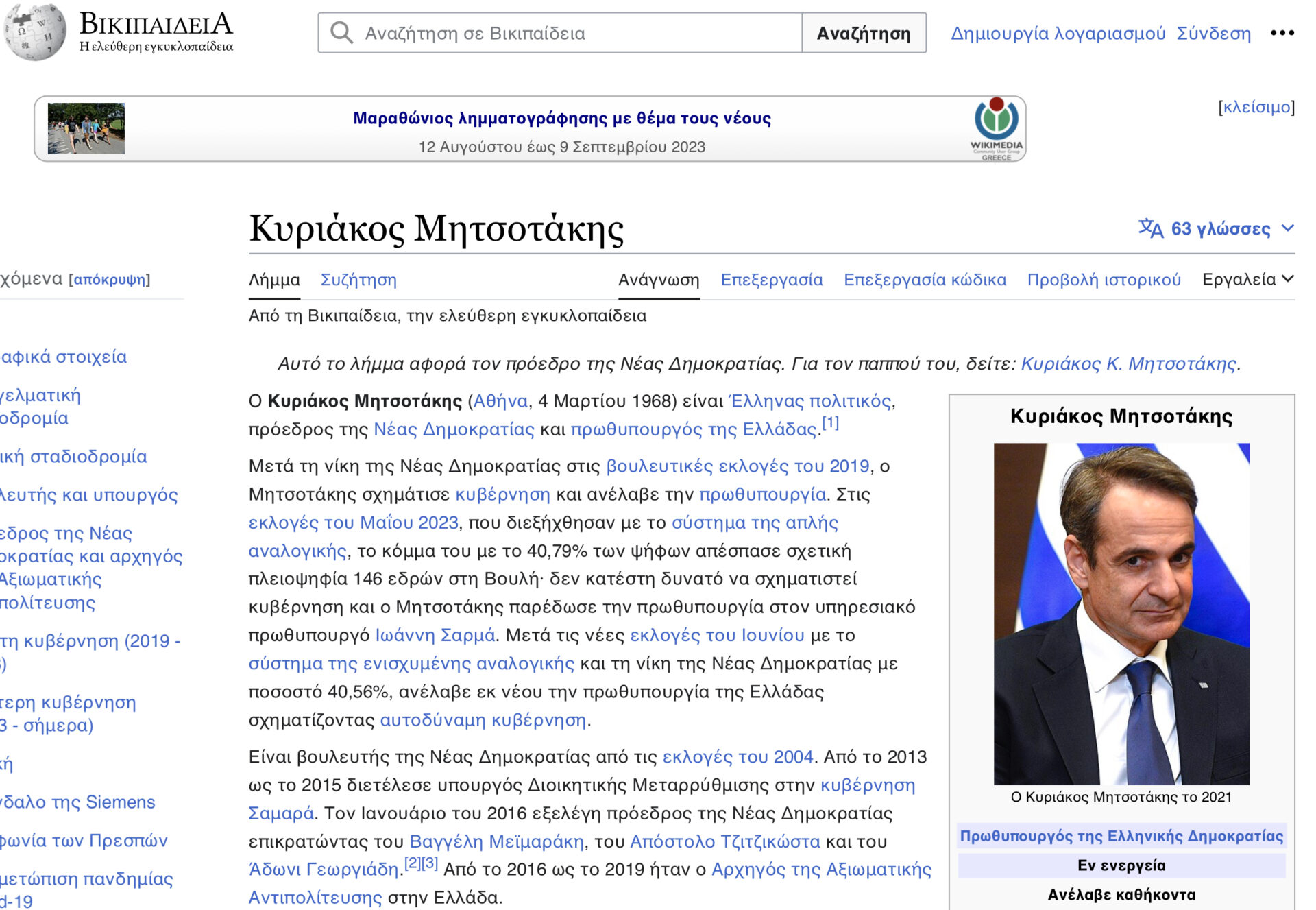 Όπως σας είχα προαναγγείλει, με το που ξημέρωσε εργάσιμη μέρα, η ομάδα ηλεκτρονικού πολέμου του Κυριάκου Μητσοτάκη έπιασε δουλειά και συνέτριψε την συκοφαντική, άθλια και προβοκατόρικη επίθεση κατά του πρωθυπουργού, μέσω της σελίδας του στην Wikipedia.
