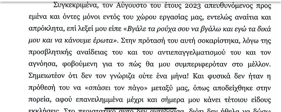 Και προσθέτει: «Συγκεκριμένα, τον Αύγουστο του 2023, απευθυνόμενος προς εμένα και όντας μόνοι μας στον χώρο εργασίας μας, εντελώς αναίτια και απρόκλητα επί λέξει μού είπε: “Βγάλε τα ρούχα σου, να βγάλω και εγώ τα δικά μου και να κάνουμε έρωτα”. Στην πρόταση αυτή σοκαρίστηκα, λόγω της προσβλητικής αναίδειάς του και του αντιεπαγγελματισμού του, και τον αγνόησα φοβούμενη για το πώς θα μου συμπεριφερόταν στο μέλλον. Δεν τον γνώριζα ούτε έναν μήνα και φυσικά δεν ήταν πρόθεσή του να σπάσει τον πάγο μεταξύ μας, όπως αποδείχτηκε στην πορεία, αφού επανειλημμένα μέχρι και σήμερα μου κάνει τέτοιου ίδιους εκκλήσεις. Στο περιστατικό αυτό δεν αντέδρασα, διότι δεν ήθελα να δώσω έκταση και γιατί θεώρησα ότι πρόκειται για ένα μεμονωμένο περιστατικό, παρά μονάχα ενημέρωσα τον σύζυγό μου.