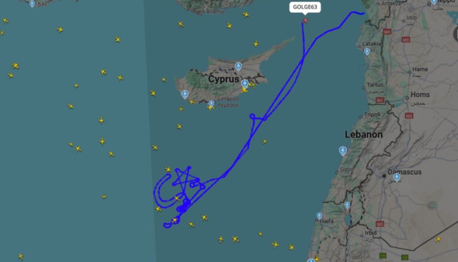 Our most tracked flight for much of the afternoon — a presumably Turkish UAV over the eastern Mediterranean drawing what seems to be the Turkish flag. 🇹🇷 https://t.co/ls1mE48Rs2 pic.twitter.com/cwziYrUtsj