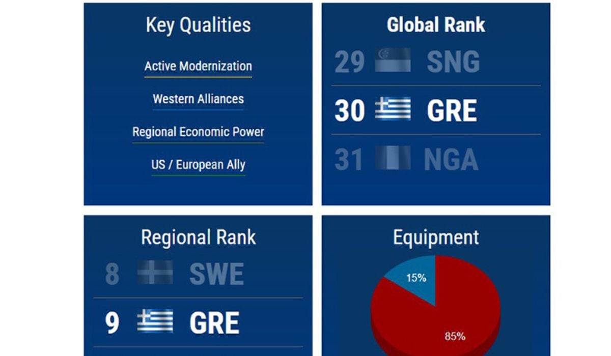 Ο ελληνικός στρατός διατήρησε τη θέση του σε σχέση με την περσινή έκθεση, καταλαμβάνοντας την 30ή θέση στην παγκόσμια κατάταξη. Πολύ κάτω από την Τουρκία. Η έκθεση σημειώνει ότι η Ελλάδα διατηρεί σημαντική αποτρεπτική ισχύ στην περιοχή της Ανατολικής Μεσογείου.