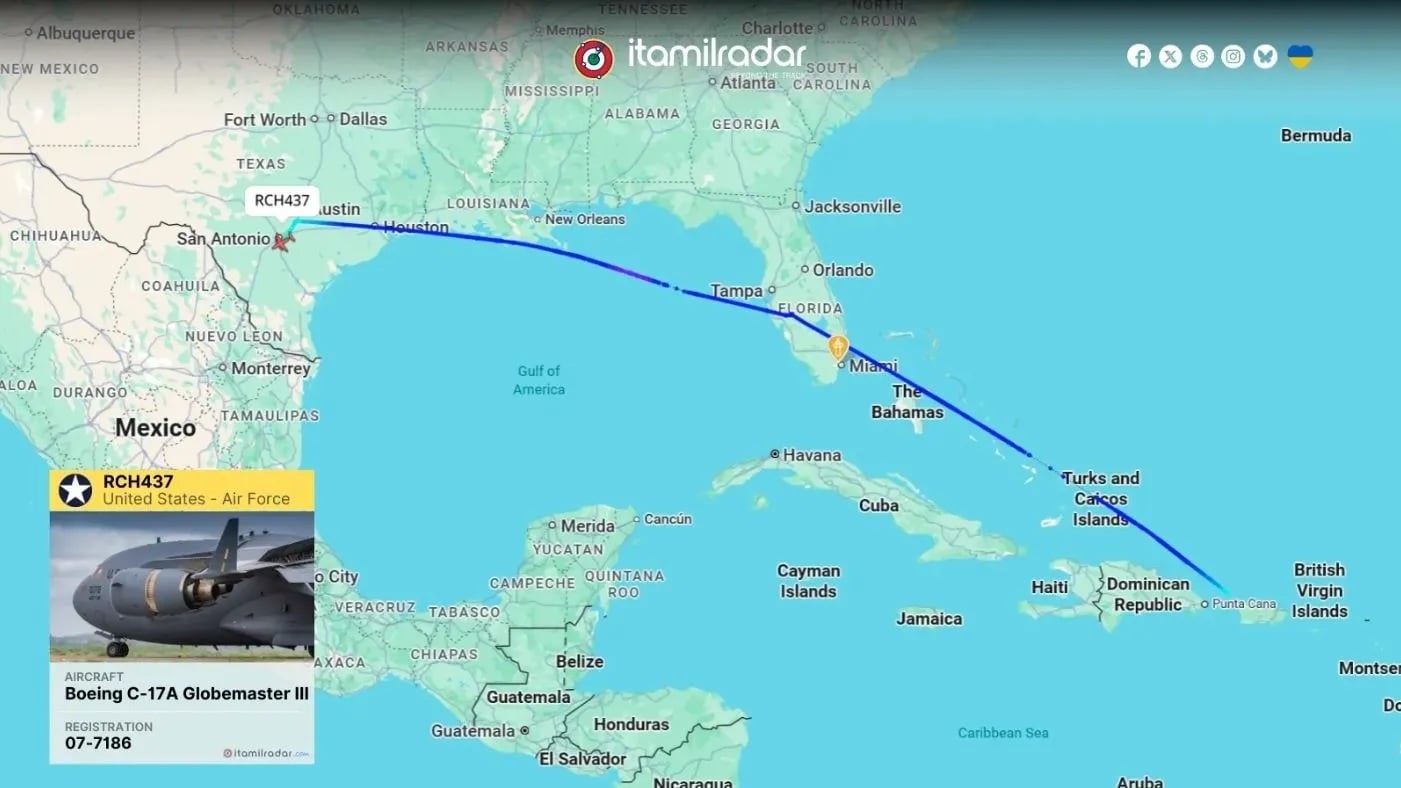 Αργά χθες τη νύχτα, ένα C-17A Globemaster III της Πολεμικής Αεροπορίας των ΗΠΑ (reg. 07-7186 – c/s RCH437) αναχώρησε από το Πουέρτο Ρίκο και προσγειώθηκε στο Σαν Αντόνιο στις 23:19 UTC, μεταφέροντας Αμερικανούς στρατιωτικούς που τραυματίστηκαν κατά τη διάρκεια της πρόσφατης επιχείρησης για τη σύλληψη του Μαδούρο στη Βενεζουέλα.