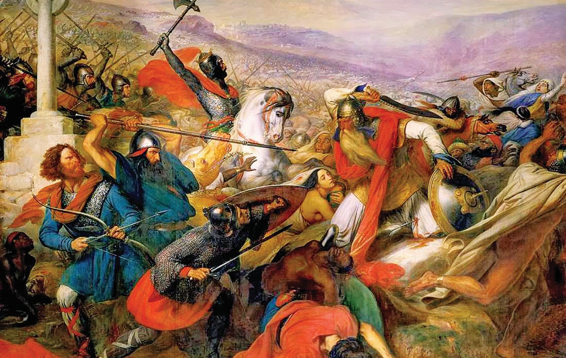 Το 732 ο Εμίρης της Κόρδοβας, διότι οι Αραβες είχαν κατακτήσει μεγάλο μέρος της Ισπανίας, συγκέντρωσε έναν ισχυρό μουσουλμανικό στρατό, έχοντας μαζί του και Βερβερικό ιππικό από τη Β. Αφρική, και εισέβαλε στην Ακουιτανία, μέρος του Φραγκικού βασιλείου, παρελαύνοντας προς την Τουρ. Ο Κάρολος και οι βαριά οπλισμένοι ιππότες του αλλά και πεζικό από την Ακουιτανία, τη Σουαβία, τη Βουργουνδία, τη Λομβαρδία, τη Νευστρασία και την Αυστρασία, περί τους 50.000, έσπευσαν να συναντήσουν τους Αραβες και Βέρβερους εισβολείς, περί τους 200.000, σε μια τοποθεσία ανάμεσα στην Τουρ και το Πουατιέ. Ο Κάρολος οδήγησε τους κατάφρακτους Χριστιανούς ιππείς σε μια θυελλώδη επέλαση. Επεσε σαν σφυρί πάνω στη μάζα των μουσουλμάνων πολεμιστών, εκεί απέκτησε το προσωνύμιο Μαρτέλ (σφυροκόπος), σκότωσε περί τους 18.000 και διέλυσε τον τζιχαντιστικό στρατό και τα όνειρα του Εμίρη της Κόρδοβα και όλων των μουσουλμάνων να φέρουν τις σημαίες του Προφήτη ως την καρδιά της Ευρώπης.
