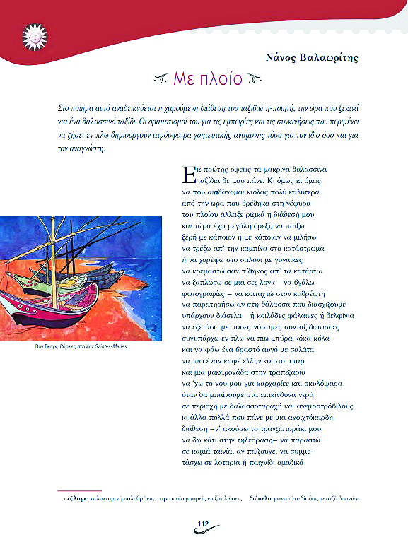 Το ποίημα που ακολουθεί δεν είναι ένα από τα πολλά που γράφτηκαν για να ξεχαστούν. Εκείνοι που… κορφολογούν την ελληνική πνευματική δημιουργία το αξιολόγησαν ως κατάλληλο για να διδαχθεί στους μαθητές της Α’ Γυμνασίου. Είναι το ποίημα του Νάνου Βαλαωρίτη «Με πλοίο», το οποίο περιλαμβάνεται στο βιβλίο «Κείμενα Νεοελληνικής Λογοτεχνίας», στη σελίδα 112.