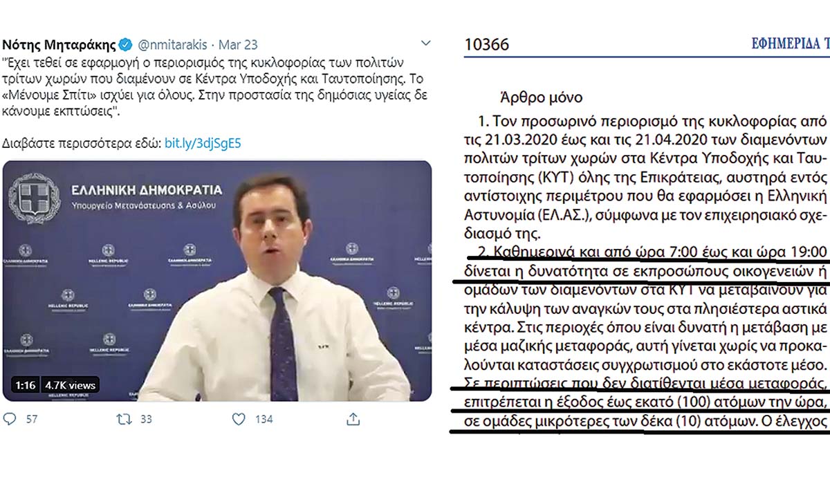 Το αστείο της υπόθεσης είναι ότι την επομένη της δημοσίευσης του ΦΕΚ ο υπουργός Μετανάστευσης και Ασύλου Νότης Μηταράκης έγραφε στο twitter: «Έχει τεθεί σε εφαρμογή ο περιορισμός της κυκλοφορίας των πολιτών τρίτων χωρών που διαμένουν σε Κέντρα Υποδοχής και Ταυτοποίησης. Το “Μένουμε Σπίτι” ισχύει για όλους. Στην προστασία της δημόσιας υγείας δεν κάνουμε εκπτώσεις».