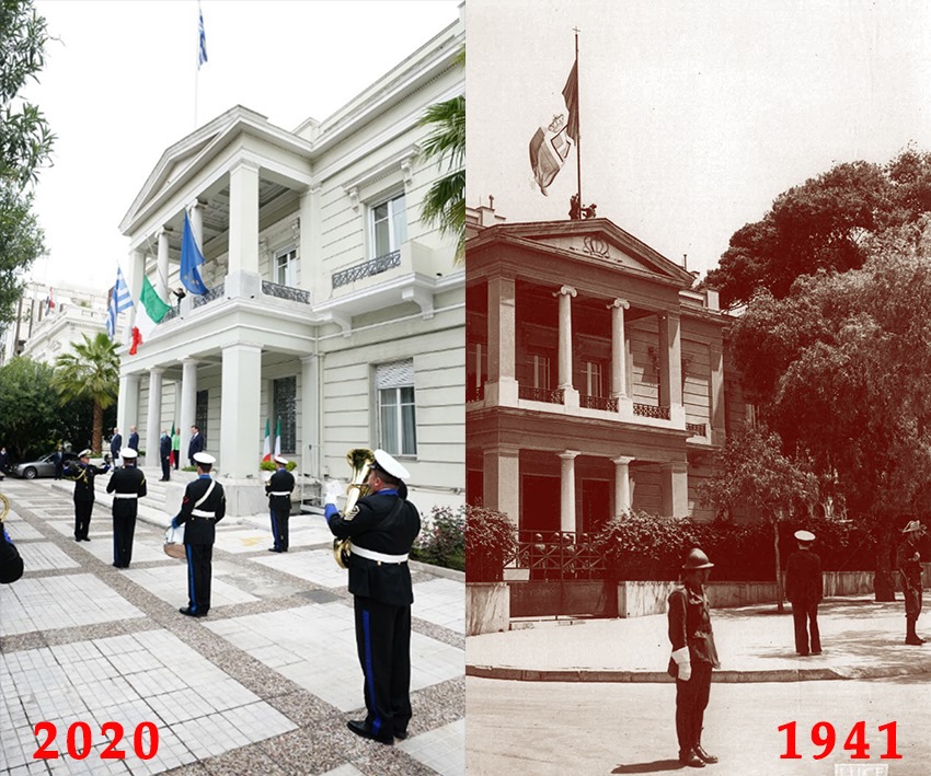 Στη φωτογραφία Νο2 βλέπουμε την ιταλική σημαία στην κεντρική είσοδο του ελληνικού υπουργείου Εξωτερικών σε δύο χρονικά σημεία: το 2020 και το 1941. Ο έγκριτος ιστορικός ερευνητής και δημοσιογράφος Δημοσθένης Κούκουνας σχολίασε στον λογαριασμό του στο facebook την πρωτοβουλία της ανάρτησης της ιταλικής σημαίας στην κεντρική είσοδο του ελληνικού υπουργείου Εξωτερικών με τα ακόλουθα: «Κάποιος ανιστόρητος εγκέφαλος είχε τη φαεινή ιδέα να αναρτήσει τιμητικά την τρικολόρε στην κεντρική είσοδο του ελληνικού υπουργείου Εξωτερικών, ώστε έτσι -λέει- να εκδηλώσουμε τη συμπαράστασή μας προς την πληττόμενη από τον κορωνοϊό Ιταλία. Καμιά καλύτερη ιδέα δεν υπήρχε, άραγε; (σ.σ.: Αριστερά, η τιμητική τελετή, δεξιά η είσοδος του κτιρίου το 1941, όταν ο Ιταλός στρατιωτικός διοικητής το είχε επιτάξει για να το χρησιμοποιεί ως έδρα του, ενώ για κατοικία ζήτησε και έλαβε το ανάκτορο του Ψυχικού…)».