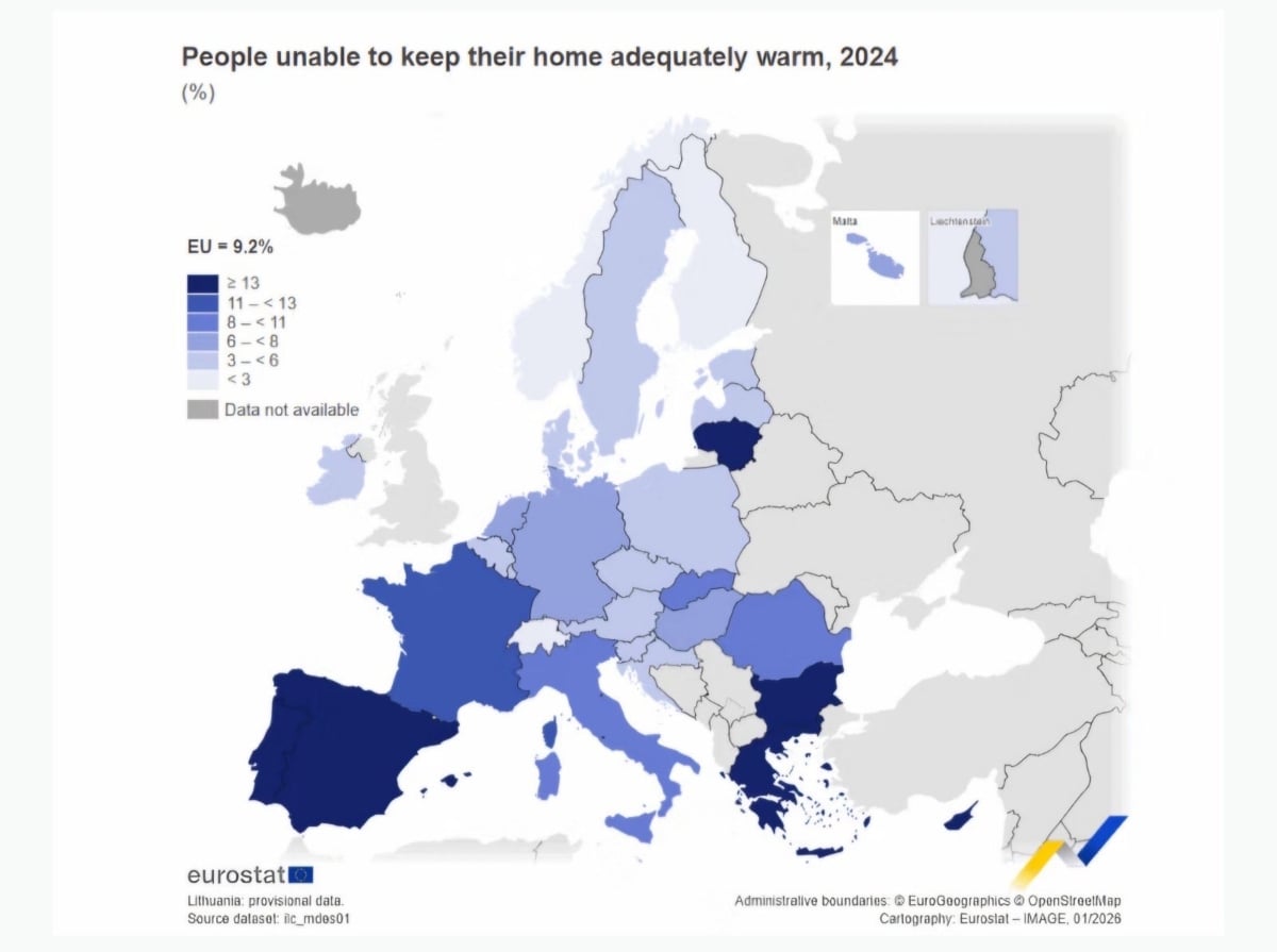 Σύμφωνα με τα στοιχεία της Eurostat για το 2024, η ενεργειακή φτώχεια εξακολουθεί να αποτελεί σοβαρό πρόβλημα στην Ευρωπαϊκή Ένωση. Συνολικά, το 9,2% του πληθυσμού της ΕΕ δήλωσε ότι δεν ήταν σε θέση να διατηρήσει επαρκή θερμοκρασία στην κατοικία του.