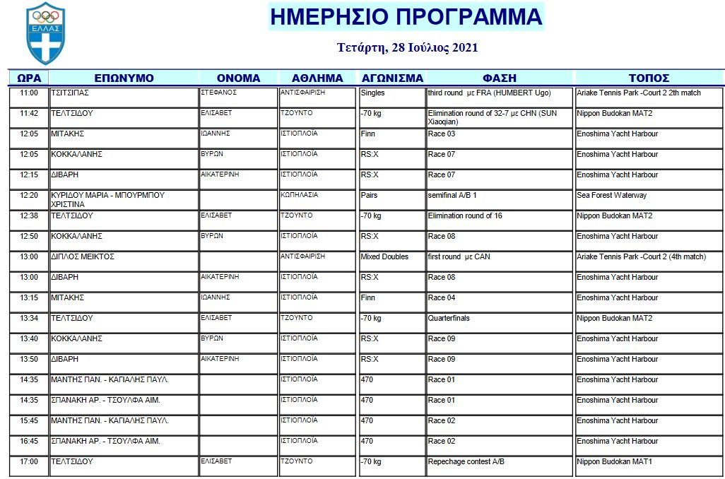 Οι ελληνικές συμμετοχές της Τετάρτης (ώρες Τόκιο):