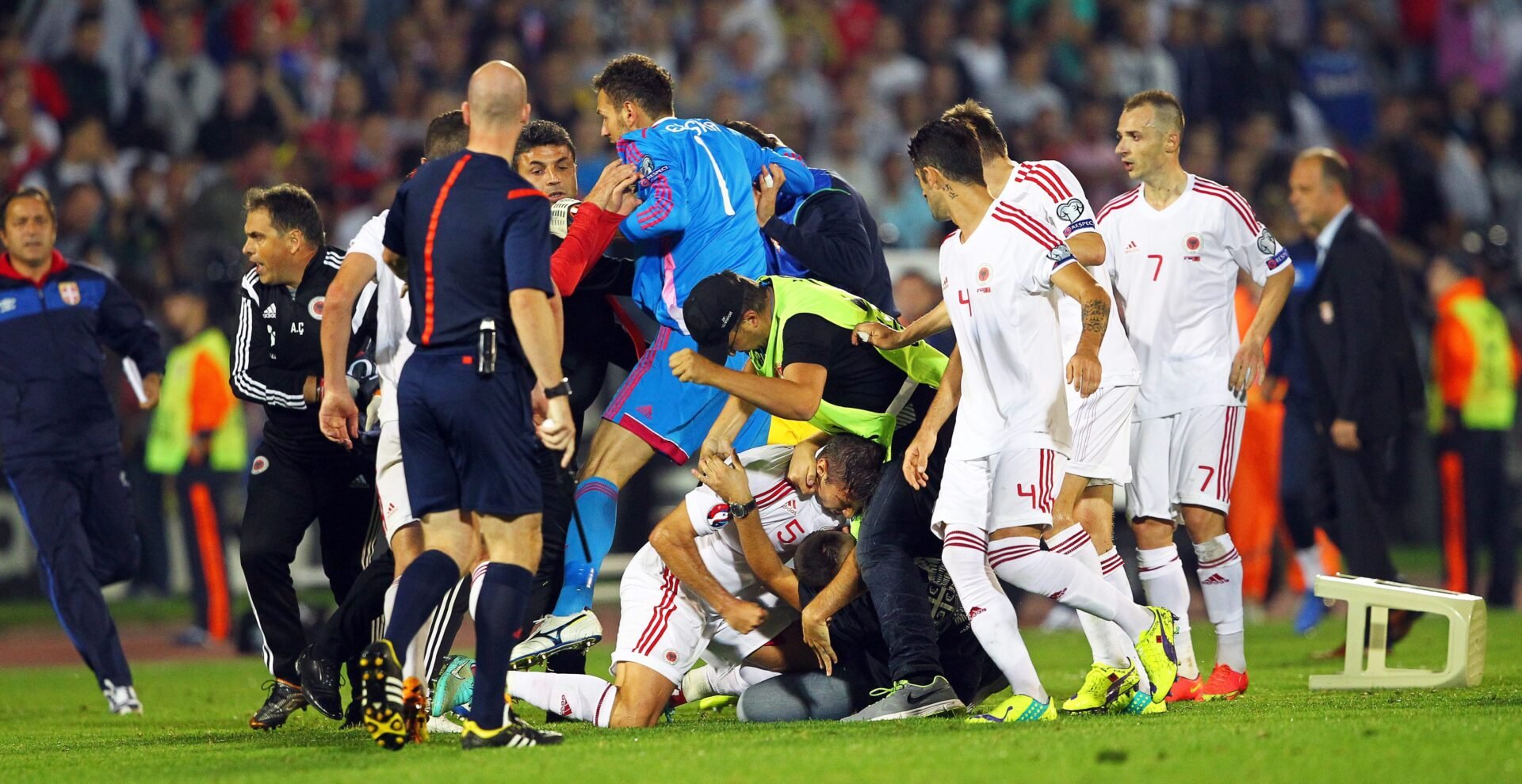 Ένα drone με το έμβλημα της Μεγάλης Αλβανίας έκανε την εμφάνιση του πάνω από το γήπεδο. Στον αγωνιστικό χώρο παίχτηκε ποδόσφαιρο για 42’. Μετά άρχισε το… κατς. Ο Άγγλος διαιτητής Μάρτιν Άτκινσον διέκοψε κακήν κακώς τον αγώνα. Η ΟΥΕΦΑ θεώρησε την Σερβία υπεύθυνη για ανεπαρκή μέτρα ασφαλείας, κατακύρωσε τον αγώνα με 3-0 υπέρ της Αλβανίας και υποχρέωσε τους γηπεδούχους να δώσουν τα δύο επόμενα ματς χωρίς θεατές.