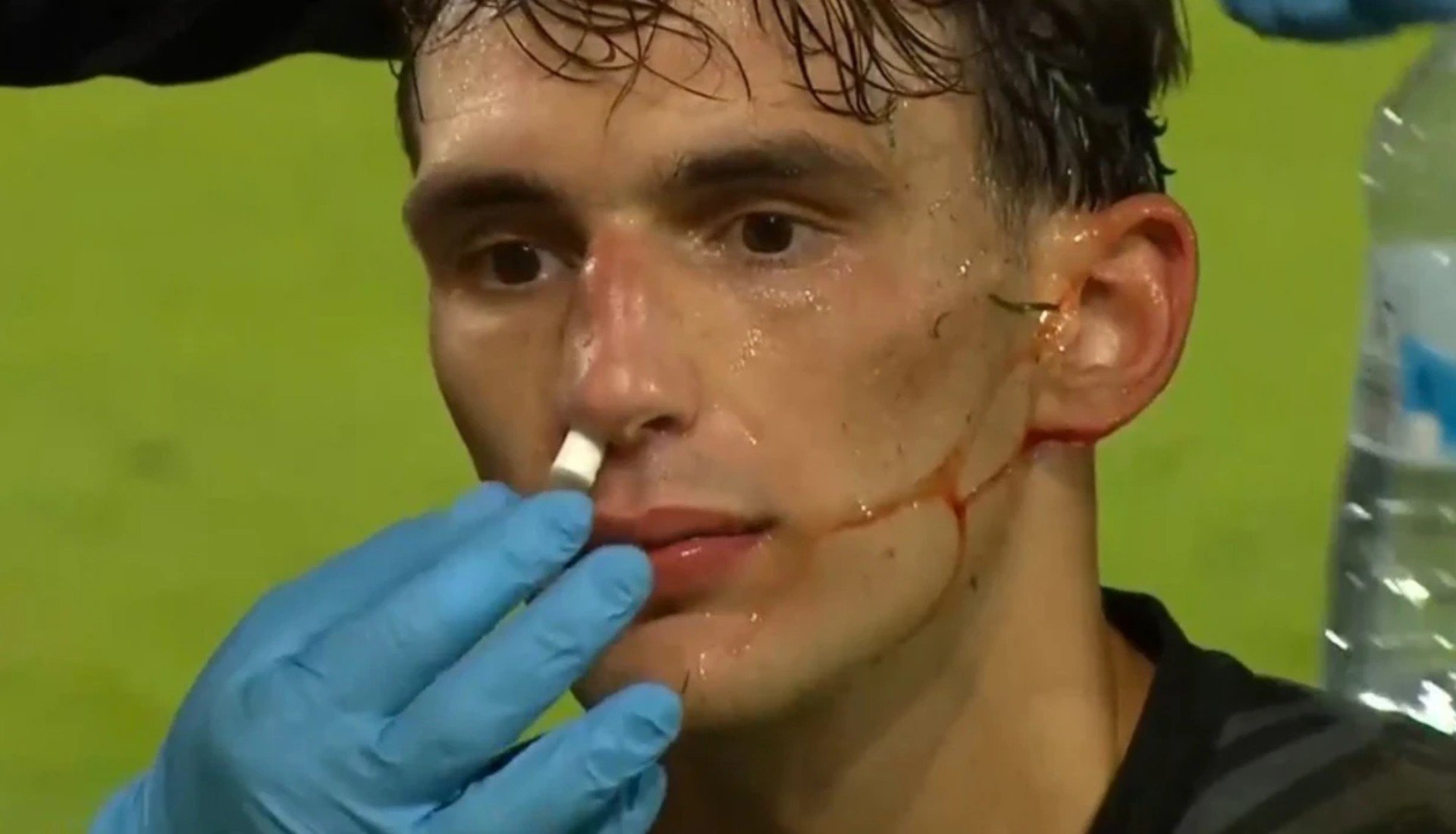 Στο 85ο λεπτό, ο 21χρονος πορτιέρε επιχείρησε να απομακρύνει μια επικίνδυνη σέντρα των Γερμανών, όμως συγκρούστηκε με το γόνατο του Νέλσον Βάιπερ, με αποτέλεσμα να τραυματιστεί στη μύτη και να ανοίξει το πρόσωπό του. Οι γιατροί της ομάδας του προσέφεραν άμεση φροντίδα, τοποθετώντας αιμοστατικό βαμβάκι για να συνεχίσει τον αγώνα, παρότι έδειχνε ζαλισμένος.