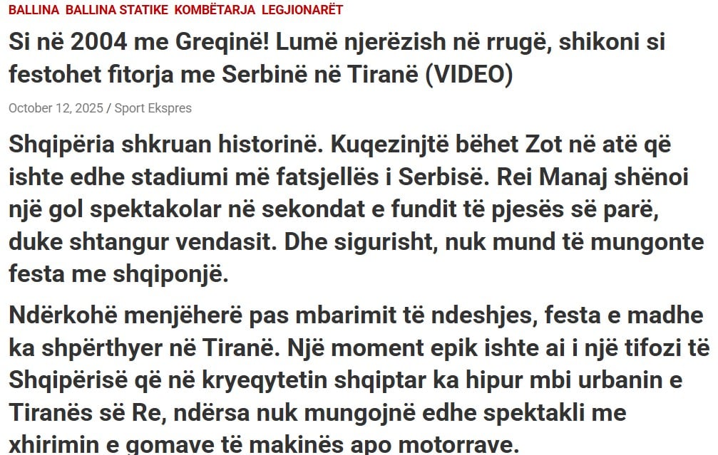 Τα Τίρανα, αλλά και άλλες μεγάλες πόλεις της Αλβανίας αμέσως μετά την νίκη της εθνικής τους μέσα στη Σερβία με 1-0 ο κόσμος ξεχύθηκε στους δρόμους για να πανηγυρίσει έξαλα, ακόμα και με πυροβολισμούς στους αέρα.