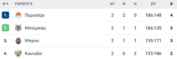 Την επόμενη εβδομάδα το Περιστέρι υποδέχεται την Μπρνο (Τσεχία) η οποία ηττήθηκε στην έδρα της από την Μπιλμπάο (51-105).