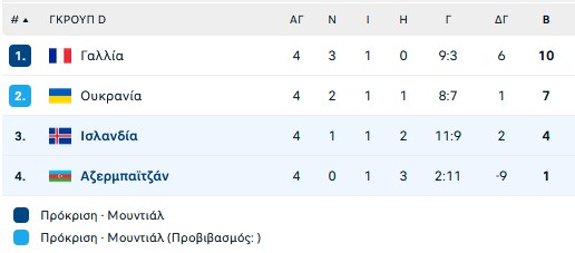 Η Γαλλία κερδίζοντας το ματς εξασφαλίζει την πρόκριση κι έχει έναν τελευταίο αγώνα την Κυριακή στο Αζερμπαϊτζάν Αφήνει τις Ουκρανία και Ισλανδία να λύσουν τις διαφορές τους για την 2η θέση στον μεταξύ τους αγώνα. Εκτός οι Ντεμπελέ, Ντουέ, Τουράμ, Τσουαμενί, απώλεια της τελευταίας στιγμής ο Μουανί, επιστρέφει ένα χρόνο μετά ο Καντέ, επανέρχονται και οι Μπαρκολά, Εμερί, Σερκί.