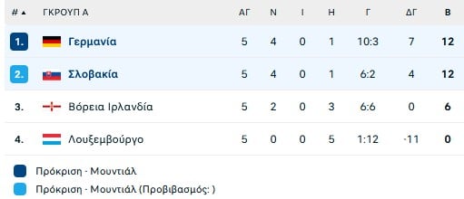 Οι Γερμανοί έχασαν με 2-0 στον αγώνα στη Σλοβακία, αλλά τους… σώζει το πρώτο κριτήριο που είναι η καλύτερη διαφορά στα γκολ, έχουν «+7», οι αντίπαλοί τους «+4» κάτι που σημαίνει ότι προκρίνονται και με ισοπαλία.