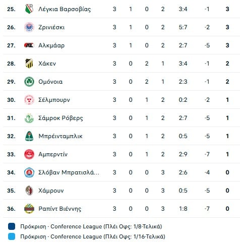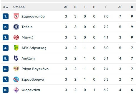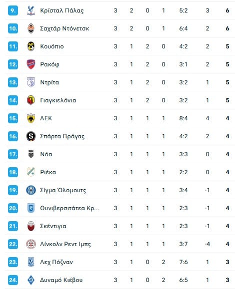 Η ΑΕΚ όπως και η Φιορεντίνα έχει πρόβλημα στο γκολ. Στην Ευρώπη δεν το έχει δείξει. Έχει σκοράρει και στους τρεις αγώνες της με συντελεστή τερμάτων 8-4. Βρίσκεται στην 15η θέση με 4 βαθμούς (απολογισμός 1-1-1) και με λίγη προσοχή μπορεί να παραμείνει στη ζώνη των μπαράζ για την πρόκριση στους «16». Εκτός έχει δώσει έναν αγώνα με την Τσέλιε (1-3).