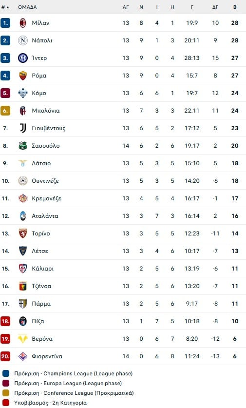 Σε βαθιά κρίση βρίσκεται η Φιορεντίνα. Στον εκτός έδρας με τη Σασουόλο (1-3) δεν μπόρεσε να αξιοποιήσει ούτε το γρήγορο γκολ που σημείωσε (9′ Μαντραγκόρα), ούτε το γεγονός ότι από το 59′ έπαιζε με παίκτη παραπάνω (αποβολή Γκρόσο).