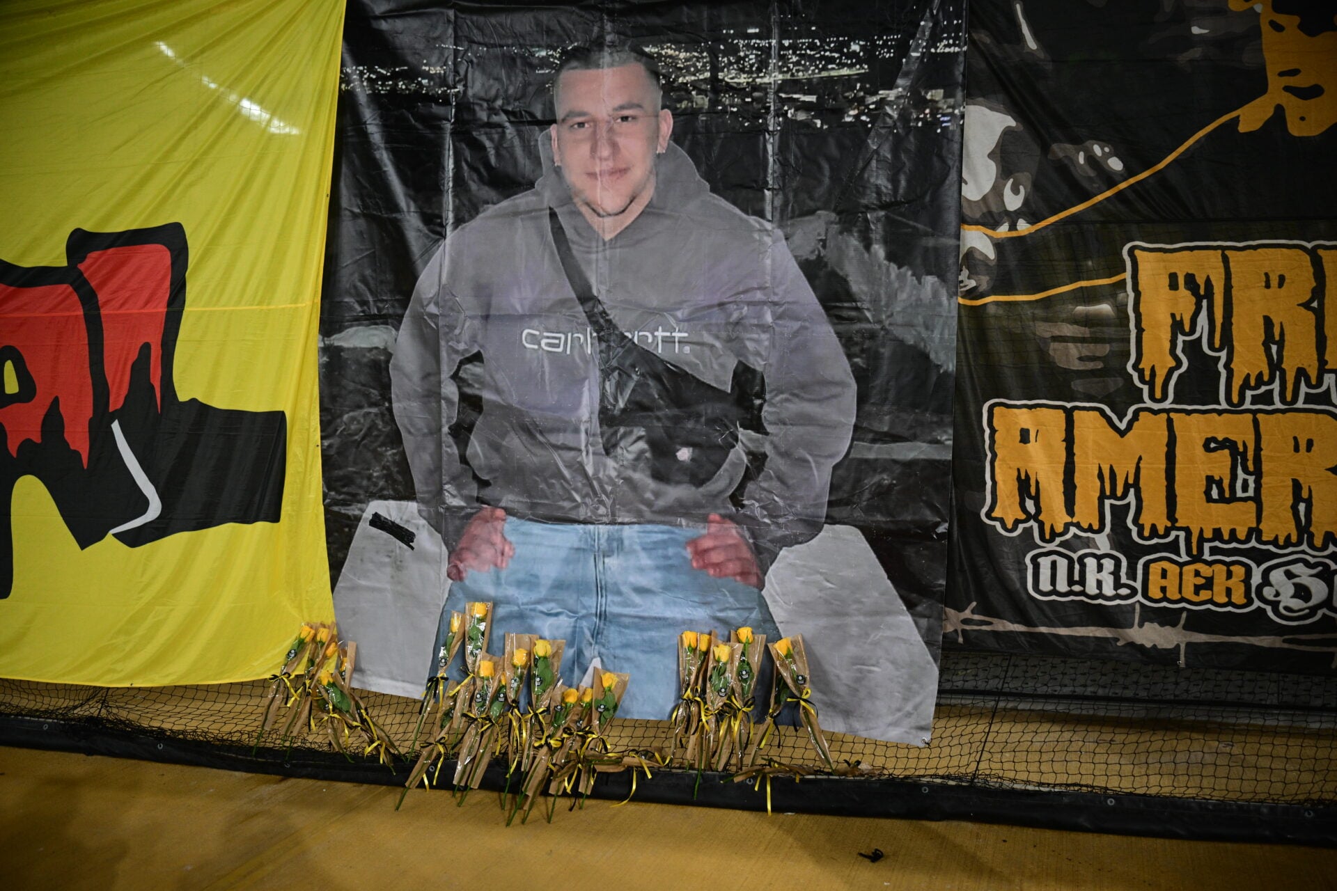 Όταν ο πόνος ενώνει. Οι οπαδοί της ΑΕΚ είχαν αναρτήσει μια πελώρια φωτογραφία του αδικοχαμένου Μάριου που πλήρωσε με τη ζωή του το τυφλό οπαδικό μένος στη Χαλκίδα, ίσως και τα δολοφονικά ένστικτα ανθρώπων που θέλουν να βρουν οπαδικές διαφορές για να τα εκδηλώσουν.