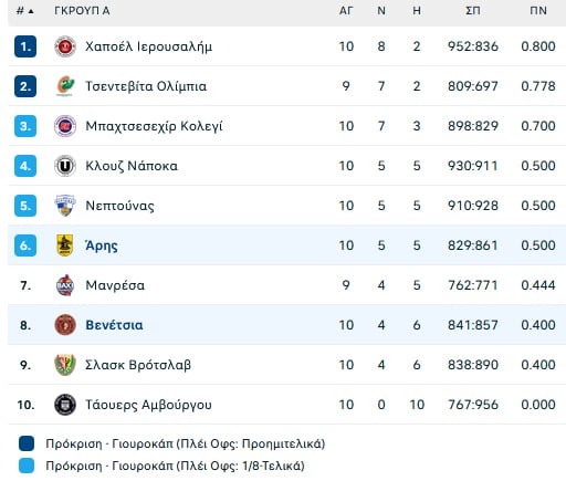 Ο Άρης ανέβηκε στο 5/5 σε νίκες/ήττες, ενώ η Βενέτσια έπεσε στο 4/6.
