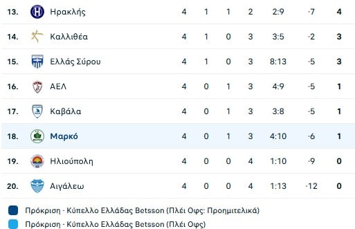 Μαρκό (Σούλης Παπαδόπουλος): Σαφαρίκας, Μπιάνκο (73’ Τσακνής), Γκτζίνι, Μιγιένγκα, Ινός, Σαζό, Μπουσάι (46’ Κυριακίδης), Μεντόζα (46’ Μίλερ), Ντέτλερ, Φατιόν (46’ Ριτσοτάκης), Σεμπά (62’ Αλεξόπουλος).