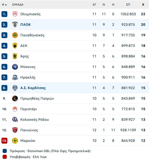 Καρδίτσα: 18/36 δίποντα, 7/22 τρίποντα, 11/21 βολές, 35 ριμπάουντ (10 επιθετικά – 25 αμυντικά), 13 ασίστ, 11 λάθη, 7 κλεψίματα, 1 μπλοκ.