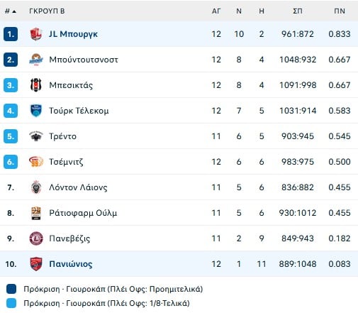 Ο Πανιώνιος παραμένει ουραγός, χωρίς ελπίδες πρόκρισης, με μία μόλις νίκη και 11 ήττες, ενώ η Μπουργκ είναι στο 10/2 σε νίκες/ήττες.