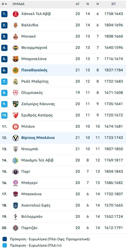 Βίρτους Μπολόνια: 16/33 δίποντα, 9/29 τρίποντα, 10/10 βολές, 35 ριμπάουντ (26 αμυντικά – 9 επιθετικά), 14 ασίστ, 5 κλεψίματα, 16 λάθη, 3 μπλοκ