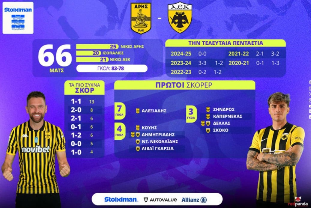 Στατιστικά: Στον α’ γύρο η ΑΕΚ νίκησε με 1-0. Ο Άρης έχει υποδεχτεί την Ένωση σε 66 αγώνες πρωταθλήματος. Έχει νικήσει 25 φορές (τελευταία το 3-2 στις 15/5/22), παραχώρησε 20 ισοπαλίες (τελευταία το 0-0 στις 9/3/25) και υπέστη 21 ήττες (τελευταία το 1-2 στις 21/4/24). Τέρματα: 83-78.