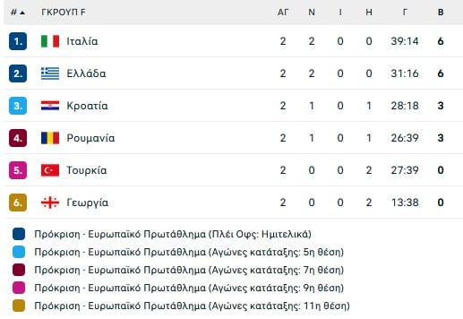 Το Σάββατο ξεκινά η β’ φάση του Ευρωπαϊκού πρωταθλήματος με την Ελλάδα να συμμετέχει σε νέο όμιλο με αντιπάλους την Τουρκία, την Ιταλία, την Ρουμανία, αλλά και τις Γεωργία και Κροατία με τις οποίες δεν θα παίξει αφού απλά θα μεταφέρει τα αποτελέσματα της πρώτης φάσης.