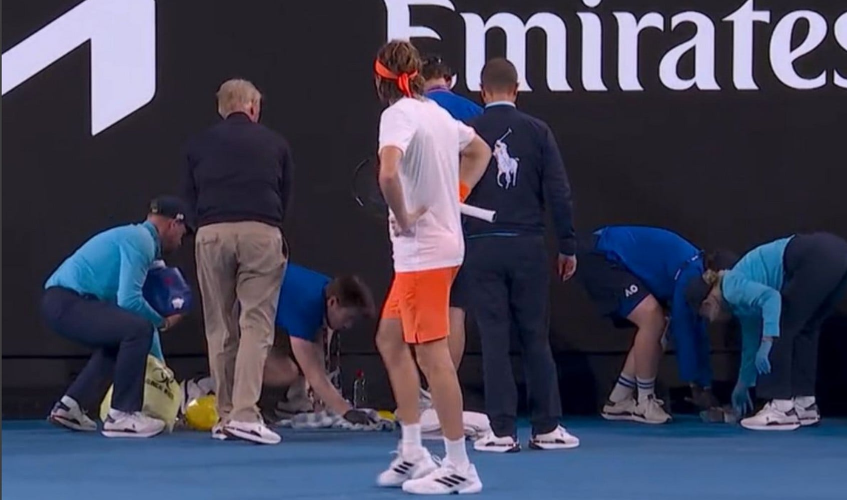 Όμως, λίγο πριν το τέλος του σετ ο αγώνας διακόπηκε. Ένα ball kid αισθάνθηκε στομαχικές διαταραχές και λέρωσε τον χώρο πίσω από τον Τσιτσιπά.