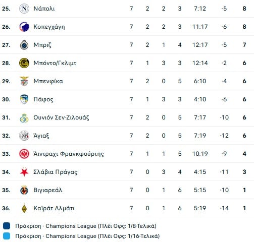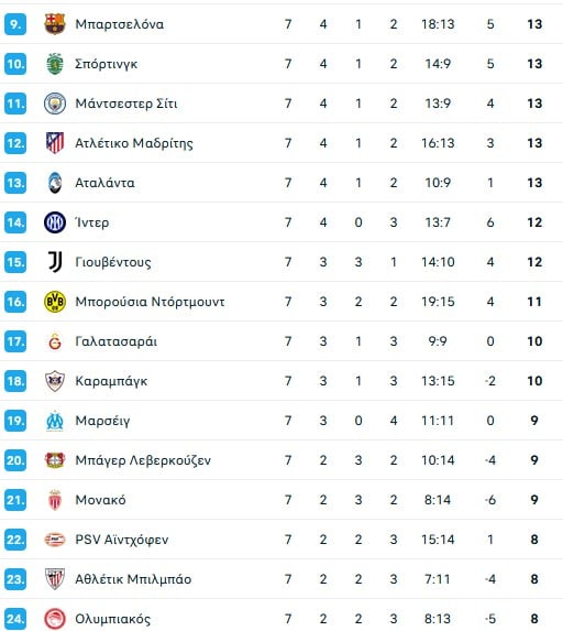 Όσο για τον Ολυμπιακό έπεσε στην 24η και τελευταία θέση. Για να παραμείνει στις 24 πρώτες χρειάζεται νίκη στο Άμστερνταμ που εξασφαλίζεται 100%, με ισοπαλία υπό προϋποθέσεις μπορεί να προκριθεί ανάλογα με τα ματς που βρίσκονται γύρω από τους δικούς του βαθμούς, ενώ με ήττα υπάρχει ακραίο σενάριο που τον οδηγεί στην πρόκριση και πάρα πολλά στον αποκλεισμό.