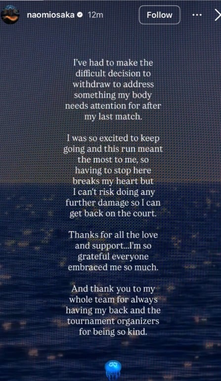 «Έπρεπε να πάρω τη δύσκολη απόφαση να αποσυρθώ, προκειμένου να αντιμετωπίσω κάτι, για το οποίο το σώμα μου χρειάζεται προσοχή μετά τον τελευταίο αγώνα μου» έγραψε η Οσάκα και πρόσθεσε: «Ήμουν τόσο ενθουσιασμένη που θα συνέχιζα και αυτή η πορεία σήμαινε πάρα πολλά για μένα, οπότε το να πρέπει να σταματήσω εδώ μου ραγίζει την καρδιά, αλλά δεν μπορώ να ρισκάρω να κάνω περισσότερη ζημιά, ώστε να μπορέσω να επιστρέψω στα κορτ».