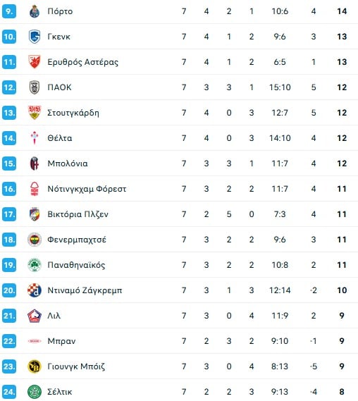 - ΠΑΟΚ (12ος) έχει «κλειδώσει» τους διπλούς αγώνες για την πρόκριση στους «16» με νίκη συνδυασμό αποτελεσμάτων μπορεί να μπει την πρώτη 8άδα.