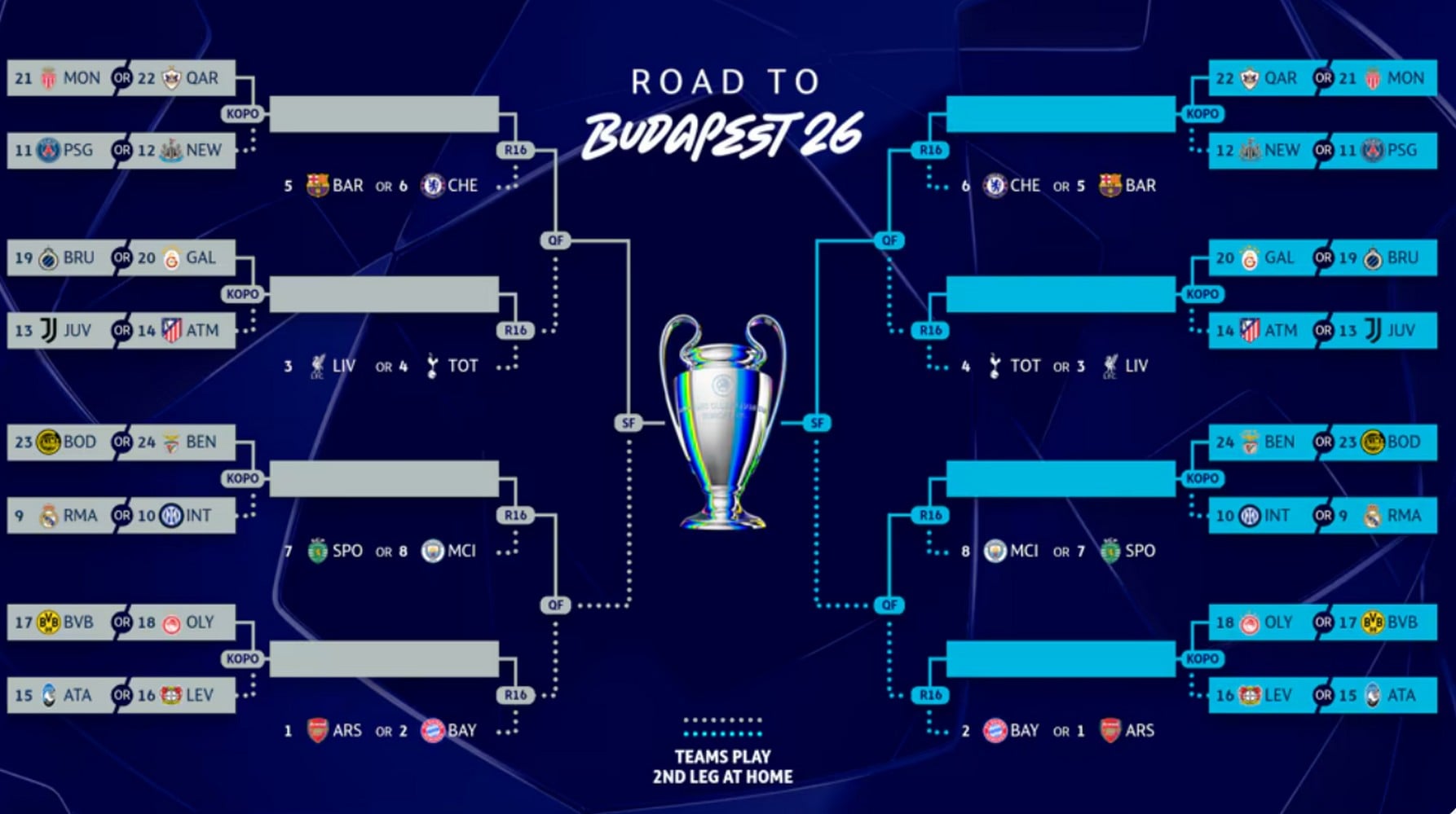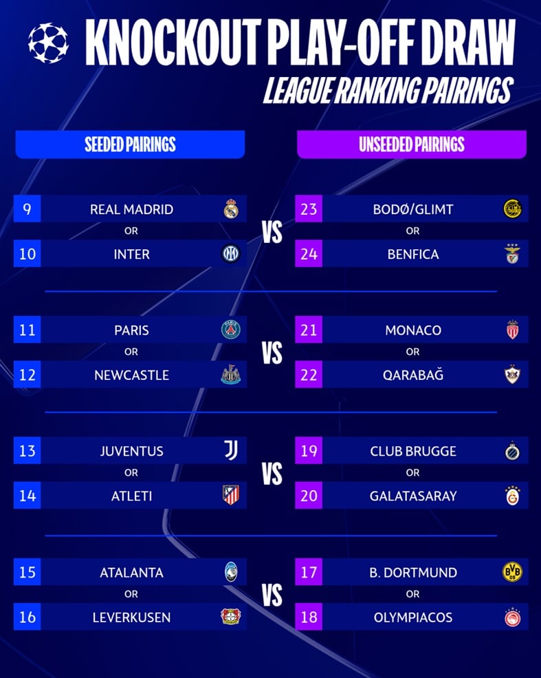 - Κλαμπ Μπριζ (19η) ή Γαλατασαράι (20η) παίξουν με τις Γιουβέντους (13η) ή Ατλέτικο Μαδρίτης (14η)