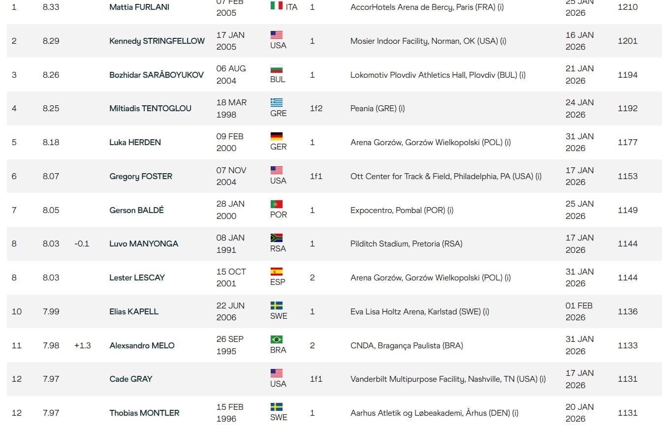 - Ο Φουρλάνι είχε κι αυτός το καλύτερο ξεκίνημα στην καριέρα του με τα 8μ.33 στο Μπερσί στο Παρίσι μια μέρα μετά (25/1) που υστερεί κατά μόλις τέσσερα εκατοστά του ατομικού του ρεκόρ στον κλειστό.