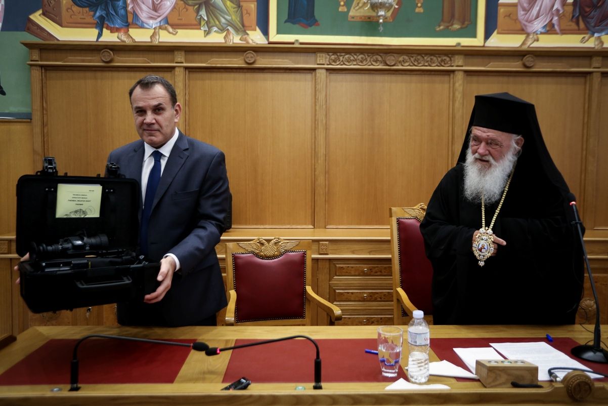 Στα γραφεία της Ιεράς Συνόδου βρέθηκε σήμερα ο υπουργός Εθνικής Άμυνας Νίκος Παναγιωτόπουλος, για να παραλάβει ειδικό εξοπλισμό, ο οποίος θα χρησιμοποιηθεί στην θωράκιση του φράκτη του Εβρου. Ο εξοπλισμός είναι αξίας 49.000 ευρώ και αφορά ηλεκτρολογικό υλικό για τη φωταγώγηση των περιφραγμένων σημείων, καθώς επίσης, πράσινο ύφασμα και συρραπτικά ώστε να γίνουν εργασίες συντηρήσεως, ενισχύσεως και επεκτάσεως του υφισταμένου φράκτη σε έκταση 8.000 τ.μ.