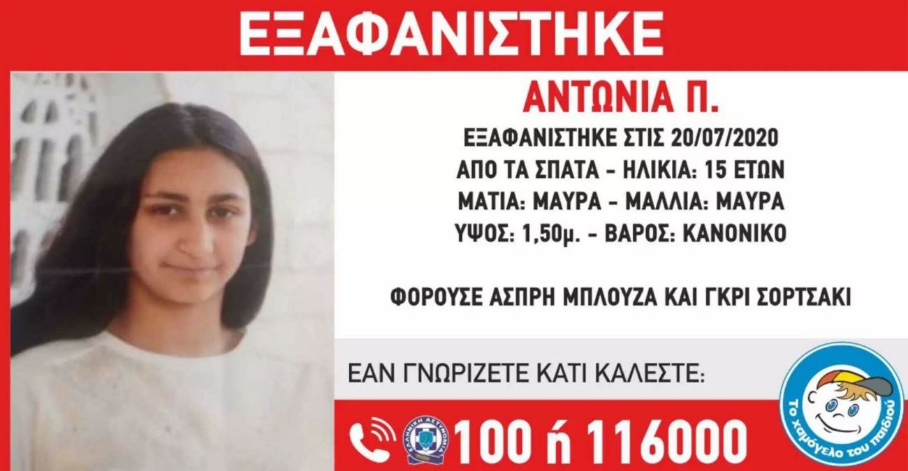 Σύμφωνα με το «Χαμόγελο του Παιδιού» η Αντωνία Π., 15 ετών, έχει ύψος 1.50 μ., μαύρα μαλλιά και την ημέρα που εξαφανίστηκε φορούσε άσπρη μπλούζα και γκρι σορτσάκι.