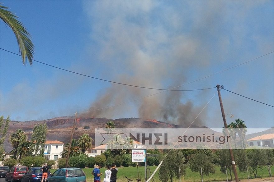 Τρόμος στη Μυτιλήνη με τη μεγάλη φωτιά που ξέσπασε το πρωί και καίει εκτάσεις χαμηλής βλάστησης μεταξύ Πέτρας και Μολύβου.