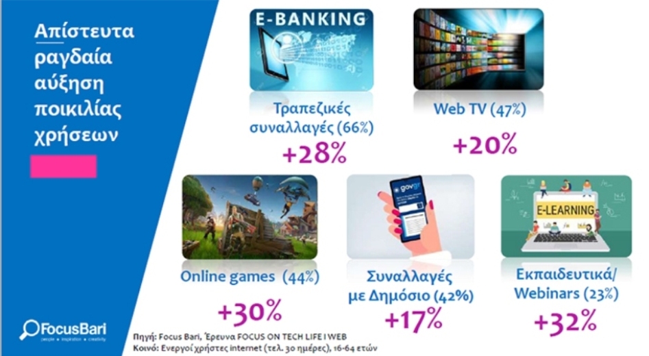 Ένα άλλο σημείο των… καιρών της καραντίνας είναι η απίστευτα ραγδαία αύξηση της ποικιλίας των χρήσεων του Διαδικτύου. Το 66% των Ελλήνων έκανε online τραπεζικές συναλλαγές την περίοδο του lockdown, αλλά και μετά την άρση του, δραστηριότητα, η οποία αυξήθηκε συνολικά κατά 28% το 1ο εξάμηνο του 2020.