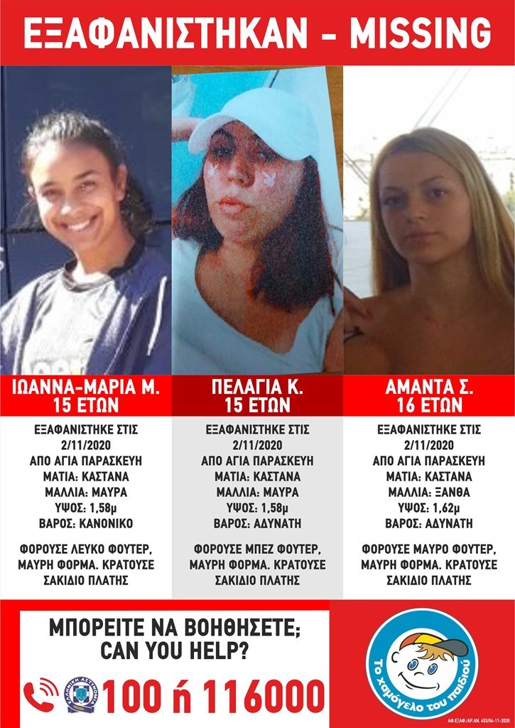 Σύμφωνα με την ανακοίνωση τα τρία κορίτσια εθεάθησαν τελευταία φορά στις 20:30 το βράδυ της Κυριακής όταν και έφυγαν από Δομή Φιλοξενίας. Οι ανήλικες βρίσκονται σε άμεσο κίνδυνο εξαιτίας των τρεχουσών συνθηκών με την πανδημία COVID-19.