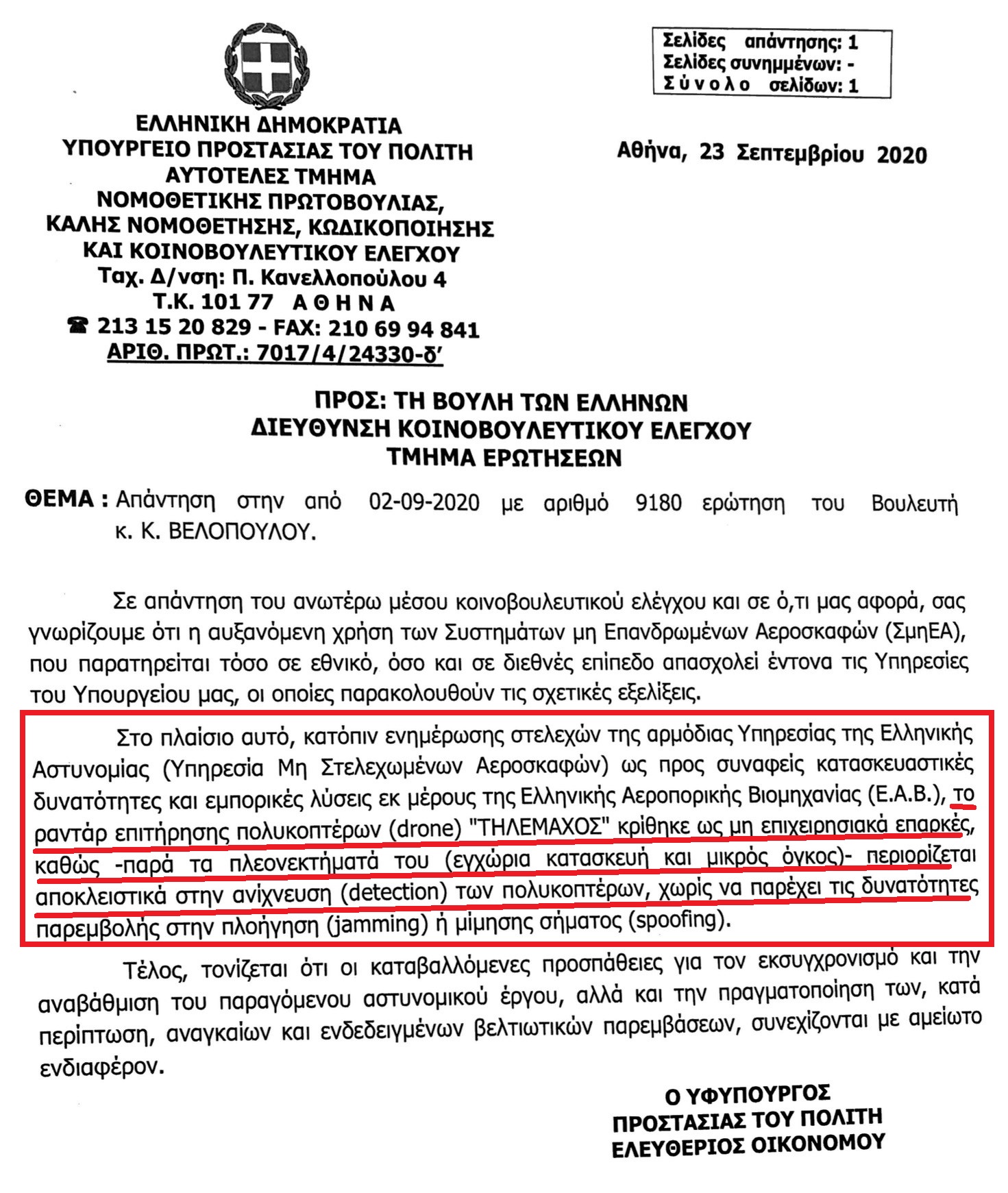 Ότι το ραντάρ “ΤΗΛΕΜΑΧΟΣ” της ΕΑΒ κρίθηκε μη επιχειρησιακά επαρκές, παρά το ότι είναι αξιόπιστο και μικρών διαστάσεων, γιατί όπως αναφέρει η απάντηση «περιορίζεται αποκλειστικά στην αποκάλυψη των drones»!