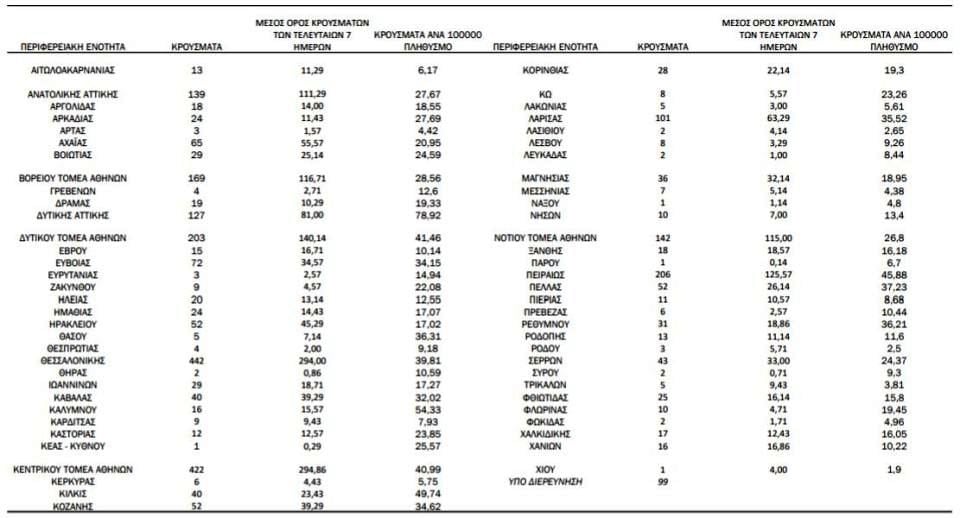 - Αναλυτικά τα νέα κρούσματα ανά περιφέρεια, σύμφωνα με τα στοιχεία του ΕΟΔΥ: