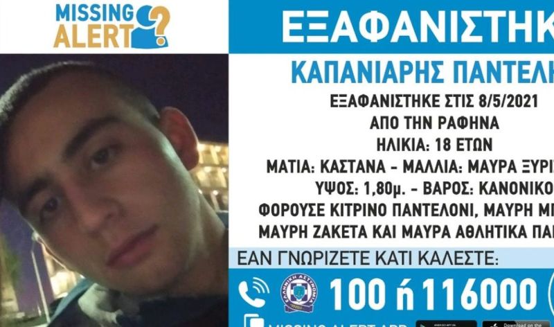 Συναγερμός έχει σημάνει στις Αρχές της Ραφήνας, αφού από χθες έχουν χαθεί τα ίχνη, του 18χρονου Παντελή Καπανιάρη.