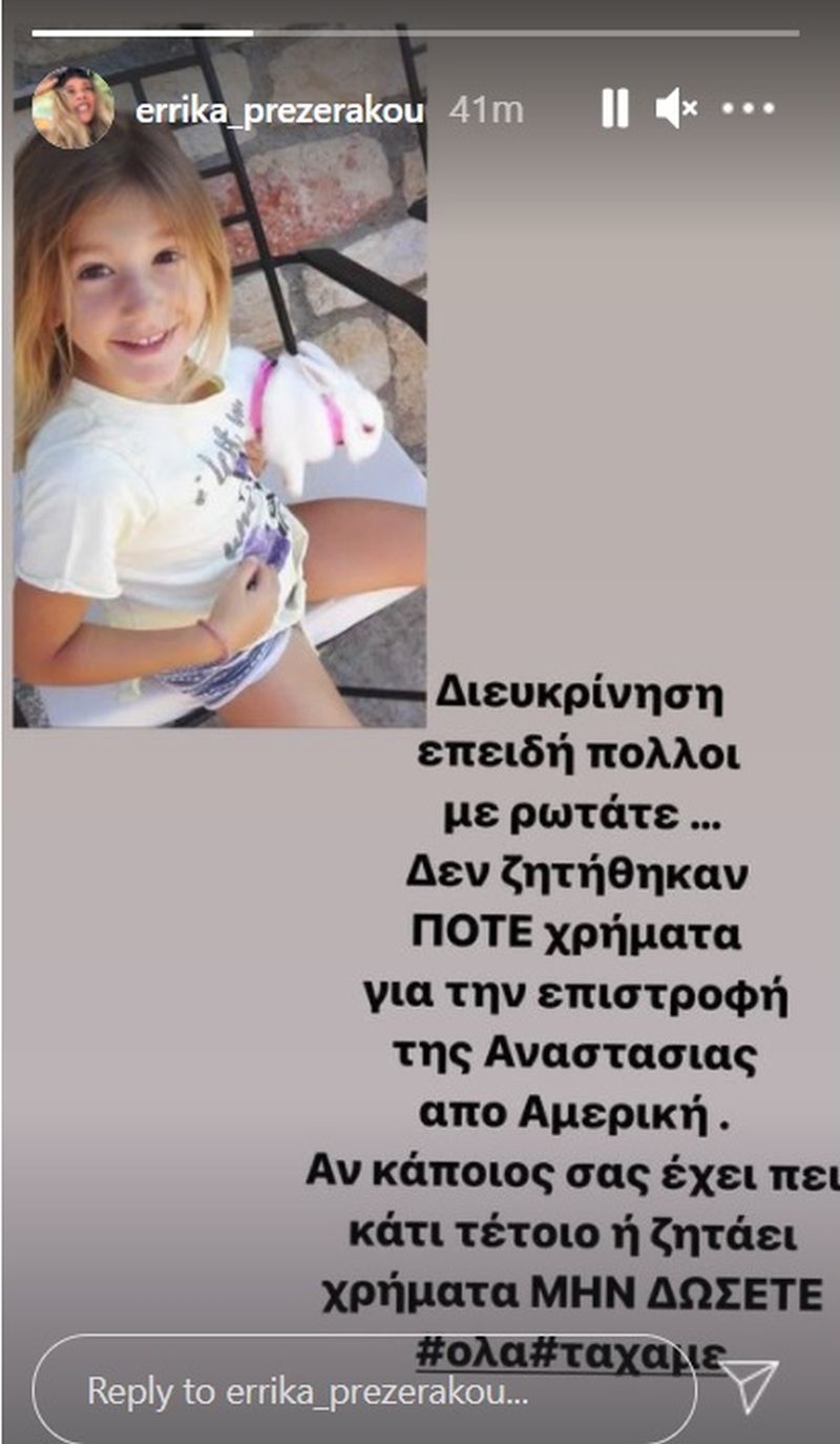 Κάποιοι απατεώνες που δεν έχουν ούτε ιερό ούτε όσιο, προσπαθούν να εκμεταλλευτούν την συγκίνηση των πολιτών και ζητούν χρήματα υποτίθεται για την μεταφορά της στην Ελλάδα. Με ανάρτησή της στο Instagram η Έρρικα Πρεζεράκου προειδοποιεί τους ακόλουθούς της να μην πέσουν «θύματα» της παγίδας.