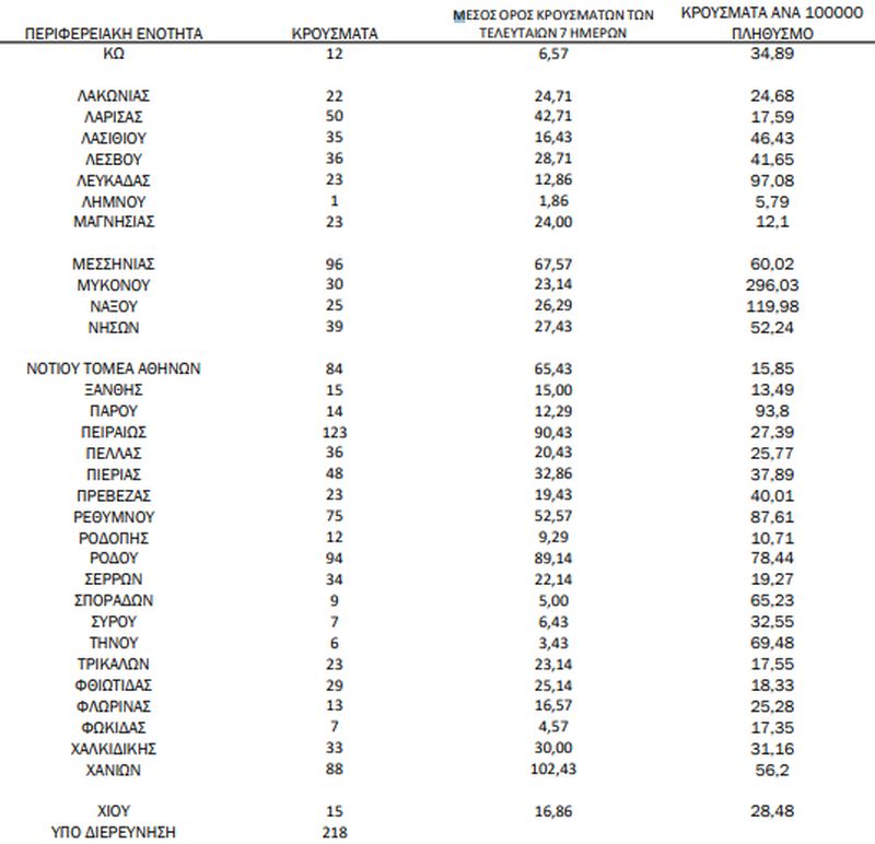 Τα νέα εργαστηριακά επιβεβαιωμένα κρούσματα της νόσου που καταγράφηκαν τις τελευταίες 24 ώρες είναι 3.442, εκ των οποίων 14 εντοπίστηκαν κατόπιν ελέγχων στις πύλες εισόδου της χώρας. Ο συνολικός αριθμός των κρουσμάτων ανέρχεται σε 547.186 (ημερήσια μεταβολή +0.6%), εκ των οποίων 51.1% άνδρες. Με βάση τα επιβεβαιωμένα κρούσματα των τελευταίων 7 ημερών, 130 θεωρούνται σχετιζόμενα με ταξίδι από το εξωτερικό και 1.492 είναι σχετιζόμενα με ήδη γνωστό κρούσμα.