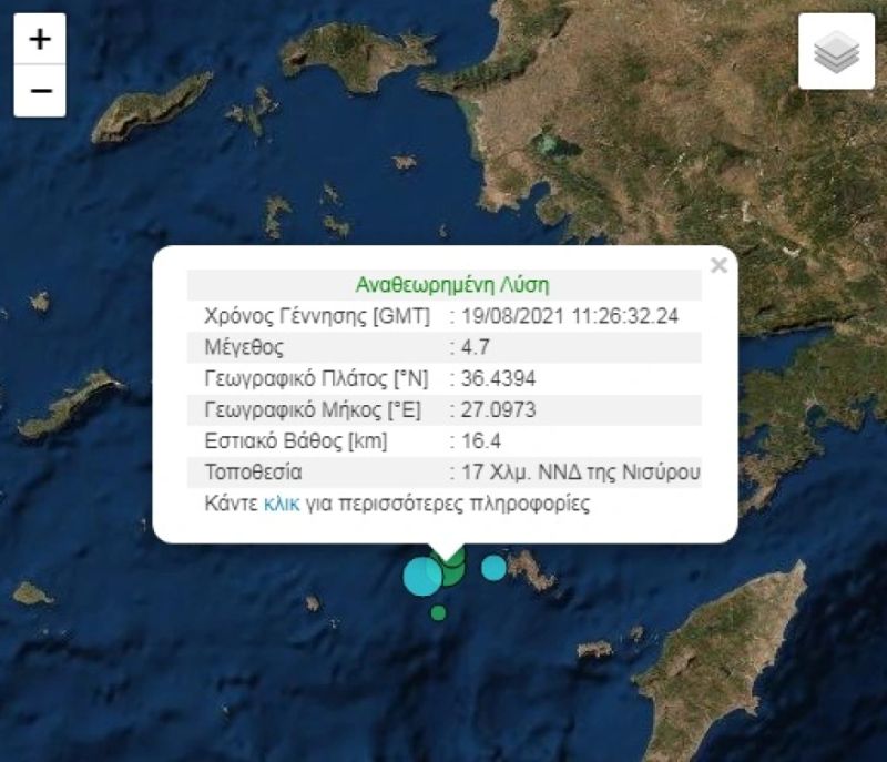 Ο δεύτερος σεισμός, που καταγράφηκε στις 14:26, ήταν 4,7 βαθμών της κλίμακας Ρίχτερ, με επίκεντρο στον θαλάσσιο χώρο 22 χιλιόμετρα δυτικά – νοτιοδυτικά της Τήλου και εστιακό βάθος στα 10 χιλιόμετρα.
