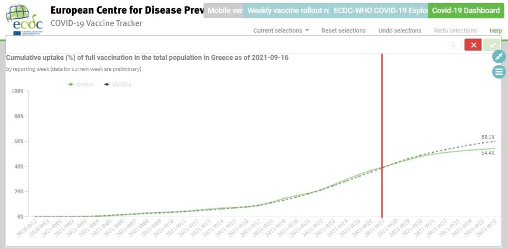 Πλέον, στην εβδομάδα 36 (από 6 έως 12 Σεπτεμβρίου) το ποσοστό εμβολιασμού στους άνω των 18 στην Ελλάδα 65.1% και στο μέσο όρο των χωρών της ΕΕ είναι 71.6%. Δηλαδή παρουσιάζεται απόκλιση της Ελλάδας κατά 6.5%. Στο σύνολο του πληθυσμού τα ποσοστά στην Ελλάδα 60.1% ενώ στο μέσο όρο των χωρών της ΕΕ είναι 65.8%. Η χώρα μας δηλαδή σημειώνει απόκλιση 5.7%.