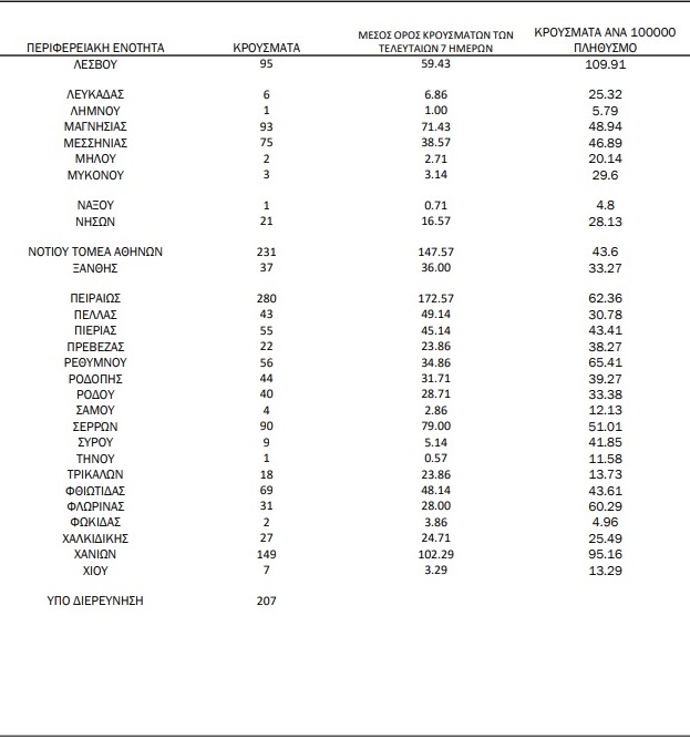 «Τα νέα εργαστηριακά επιβεβαιωμένα κρούσματα της νόσου που καταγράφηκαν τις τελευταίες 24 ώρες είναι 5.641, εκ των οποίων 8 εντοπίστηκαν κατόπιν ελέγχων στις πύλες εισόδου της χώρας. Ο συνολικός αριθμός των κρουσμάτων ανέρχεται σε 1.049.936