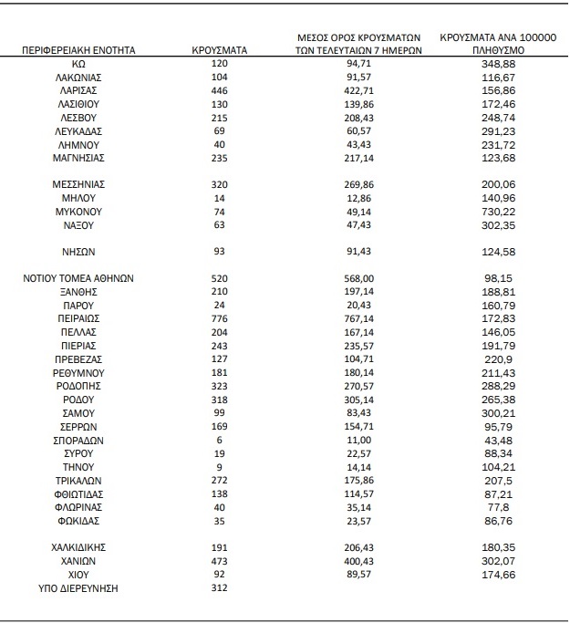 Με βάση τα επιβεβαιωμένα κρούσματα των τελευταίων 7 ημερών, 412 θεωρούνται σχετιζόμενα με ταξίδι από το εξωτερικό και 2.472 είναι σχετιζόμενα με ήδη γνωστό κρούσμα.
