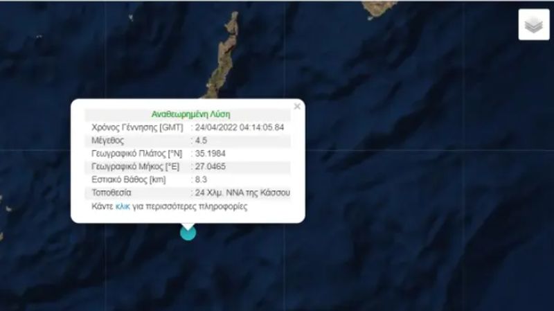 Ο σεισμός, που καταγράφηκε στις 7:14 σήμερα το πρωί, είχε εστιακό βάθος 8,3 Χλμ και επίκεντρο στα 24 χιλιόμετρα νότια, νοτιοανατολικά της Κάσσου, σύμφωνα με της καταγραφές του Γεωδυναμικού Ινστιτούτου του Εθνικού Αστεροσκοπείου Αθηνών.