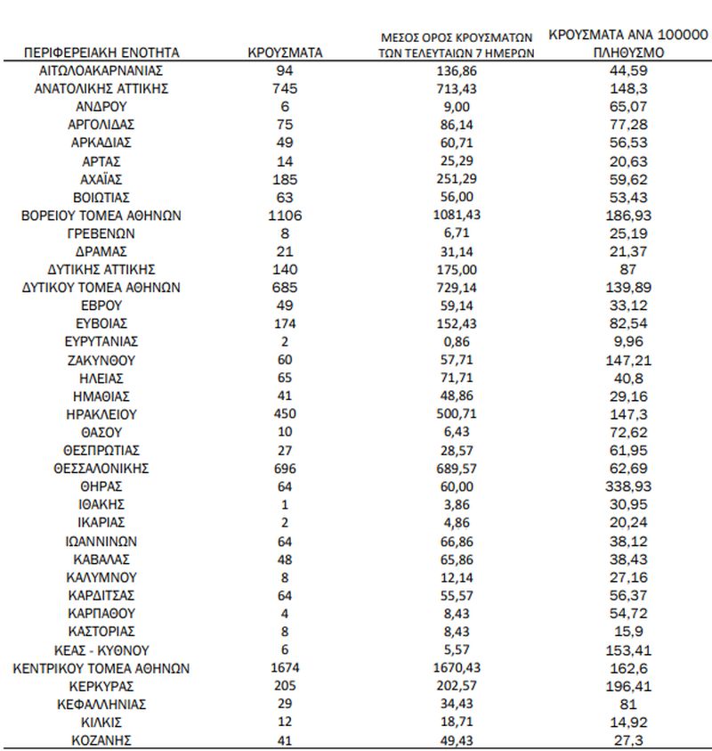 Τα νέα εργαστηριακά επιβεβαιωμένα κρούσματα της νόσου(άτομα) που καταγράφηκαν τις τελευταίες 24 ώρες ήταν 9.294. Ο συνολικός αριθμός των ατόμων που νόσησαν ανέρχεται σε 3.616.874 (ημερήσια μεταβολή +0.2%), εκ των οποίων 48.6% άνδρες.